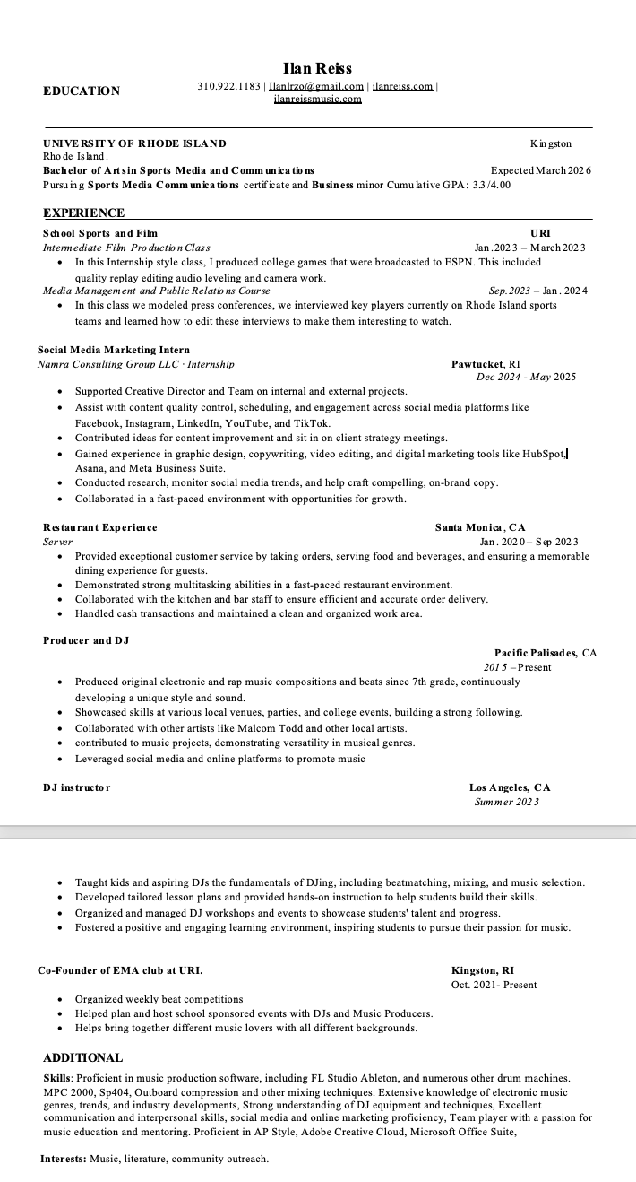 Hi, I’m Ilan Reiss. I'm a multi-talented creative based in Rhode Island. Originally from Los Angeles, I'm pursuing my studies at the University of Rhode Island. I specialize in DJing, music production, and photography, blending technical expertise with artistic vision. Creativity runs through everything I do. Whether producing beats in the studio, capturing moments behind the lens, or spinning tracks as a DJ, my goal is always to push boundaries and deliver unique, engaging work. Beyond the arts, I have a knack for technology, which fuels my versatility and ability to adapt across various projects and mediums. Whether you’re looking for fresh sounds, stunning visuals, or a touch of innovation, I’m here to bring your ideas to life.